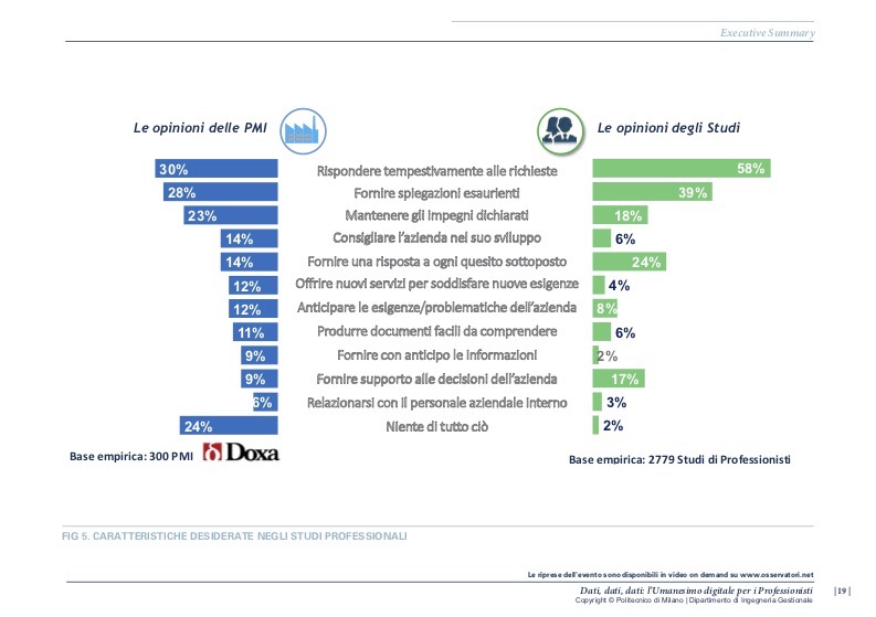 Sette Pmi su dieci sono soddisfatte dei servizi tradizionali offerti dagli studi, ma se si considerano i servizi innovativi abilitati dalla capacità di raccogliere e sfruttare i dati la situazione cambia. Solo il 29% delle aziende condividerebbe altri dati con gli studi professionali, che in generale appaiono impreparati su questo fronte: appena un quarto fornisce servizi di controllo di gestione e circa il 3% utilizza i software di business intelligence per organizzare servizi basati sui dati.