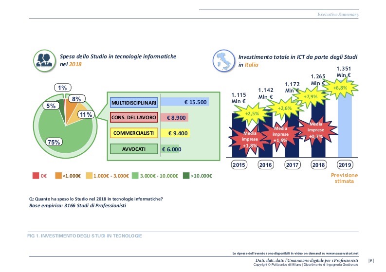 La spesa Ict di avvocati, commercialisti, consulenti del lavoro e studi multidisciplinari raggiunge nel 2018 il valore di 1.265 milioni di euro, con una crescita del 7,9% rispetto all’anno precedente.