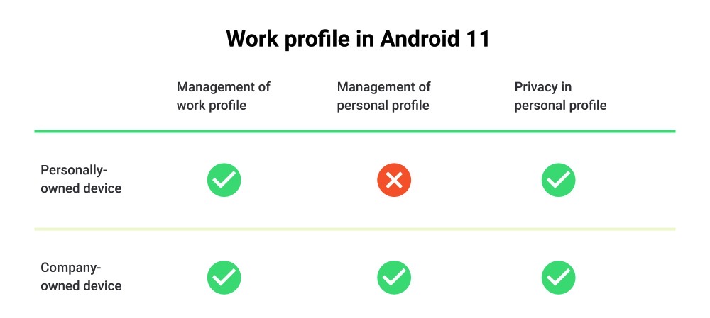 Ma se è l’azienda a possedere il dispositivo, l’It può ora gestire il modo in cui gli utenti interagiscono con l’intero dispositivo. In questo modo, il profilo lavoro regola le sue funzionalità di gestione in base a chi possiede il dispositivo, offrendo allo stesso tempo le stesse protezioni della privacy in tutti gli scenari.