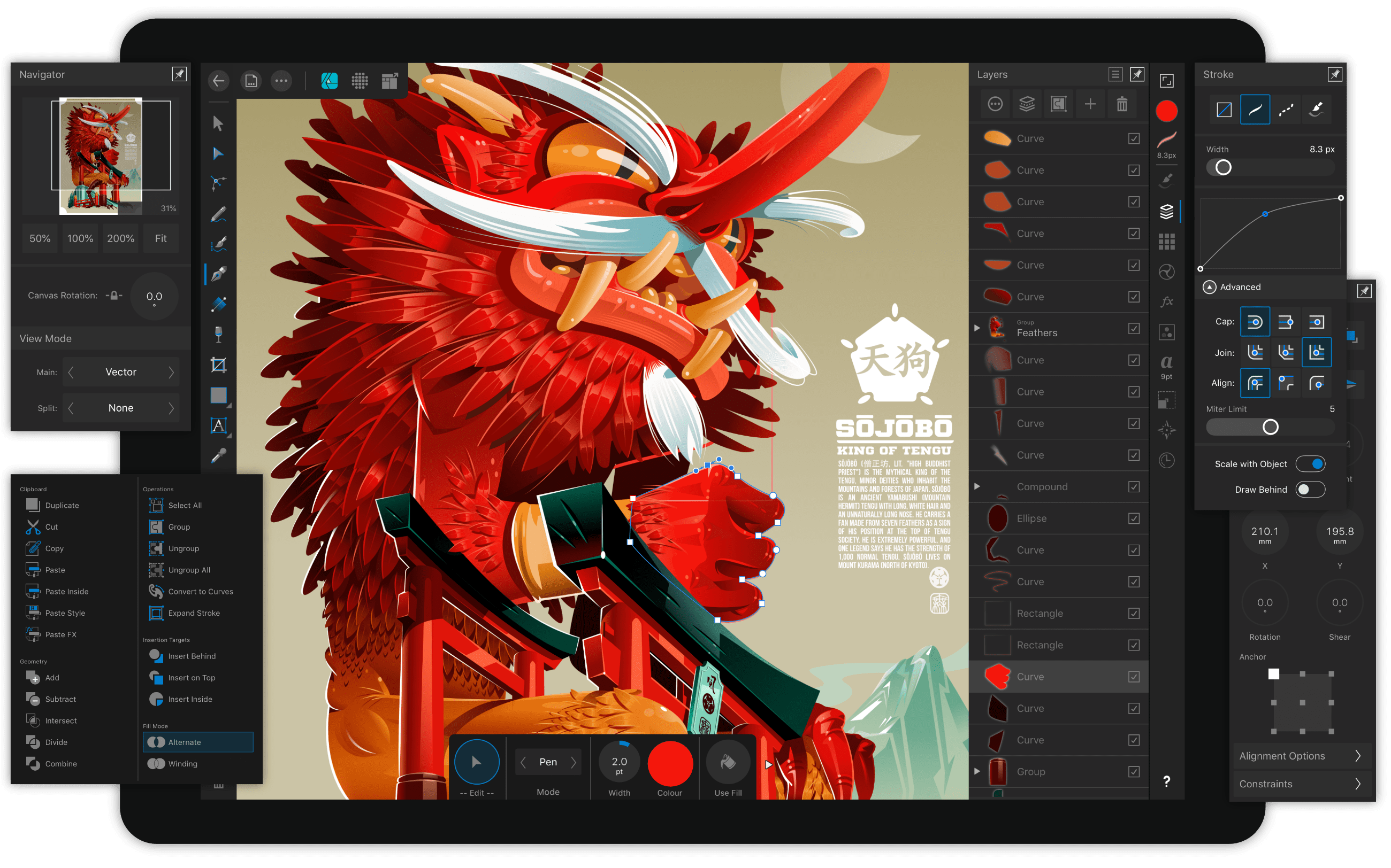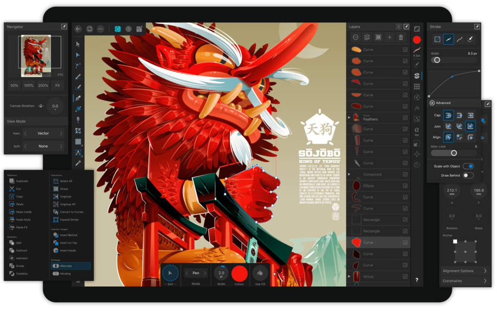 Affinity Designer offre strumenti vettoriali per creare curve in maniera precisa, disegnando e modificando nodi e maniglie di Bezier. E consente, a seconda delle preferenze del designer, di disegnare con le dita o con la Apple Pencil. Gli strumenti sono stati infatti ripensati per l’utilizzo sul tablet e ottimizzati per l’interazione touch.
