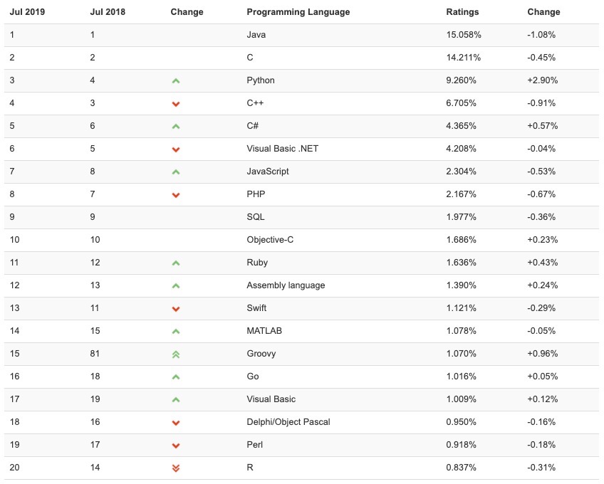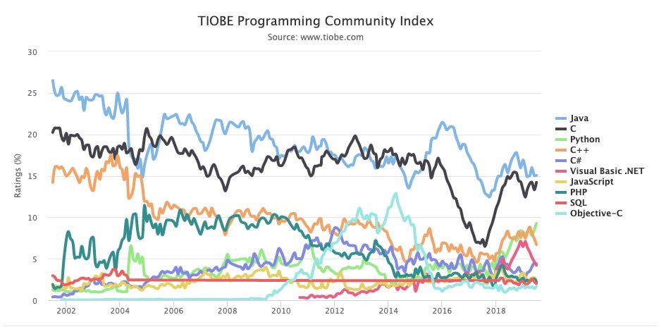 Le prime due posizioni dell’indice rimangono invariate, occupate rispettivamente da Java e C. Python conquista un’altra posizione, arrivando al terzo posto, con, alle sue spalle: C++, C#, Visual Basic .NET, JavaScript, PHP, SQL e Objective-C a completare la top 10.
