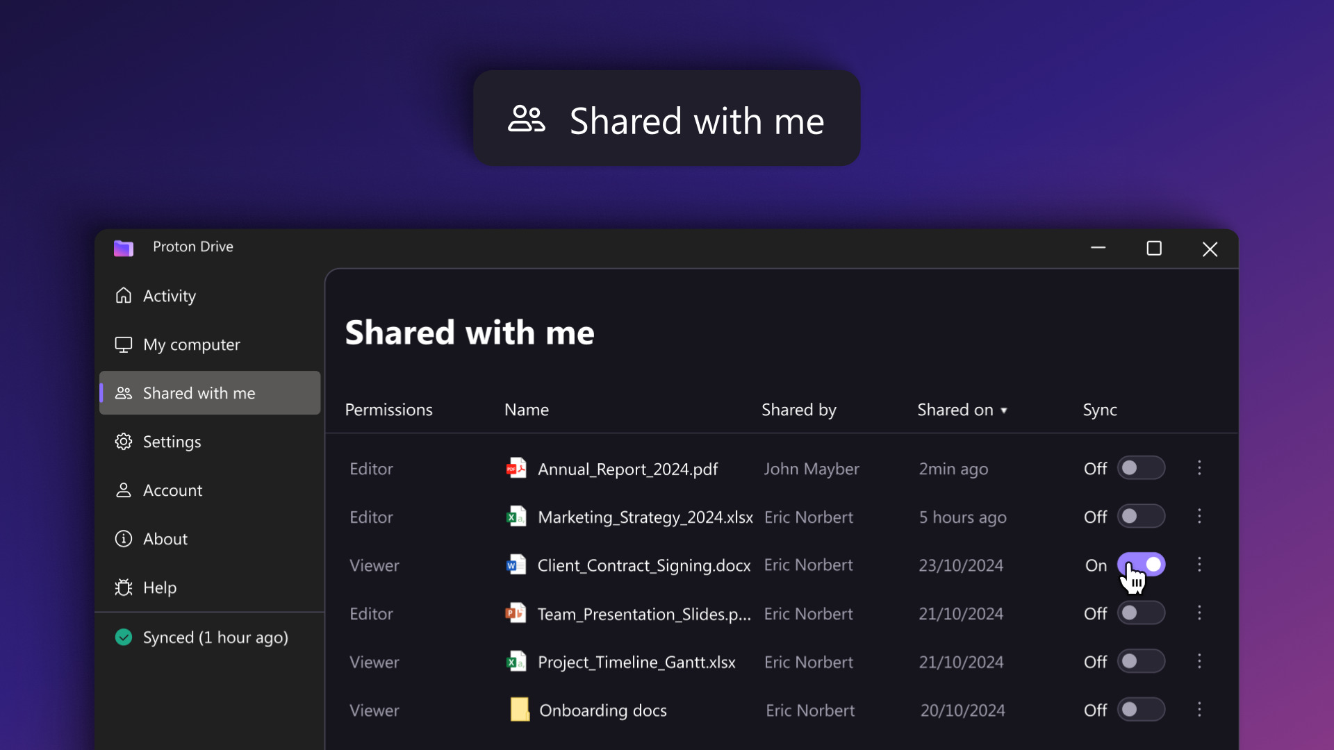 La funzionalità Condivisi con me nell’app Proton Drive per Windows semplifica la collaborazione centralizzando l’accesso ai file condivisi da colleghi e clienti e consente di organizzare i documenti condivisi in un unico posto, eliminando la necessità di cercare tra le email o le schede del browser. Gli utenti possono sincronizzare i file per l’accesso offline, riuscendo a mantenere la propria produttività anche in assenza di una connessione Internet stabile, e ritrovare le ultime modifiche apportate all’accesso successivo.