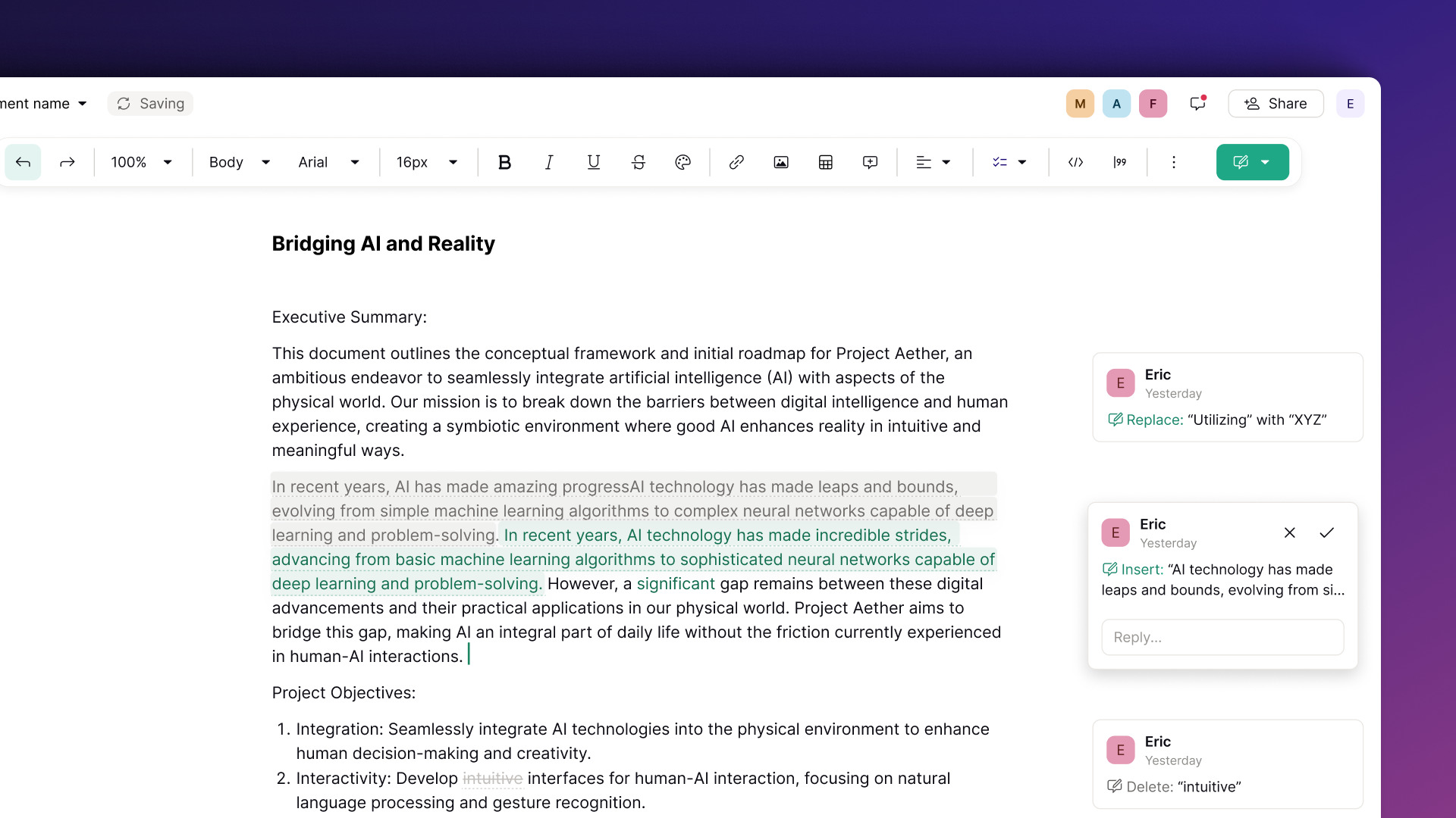 - Tracciamento delle modifiche: gli utenti possono facilmente tenere traccia delle modifiche apportate dai membri del team, accettare, rifiutare o modificare i suggerimenti, migliorando il flusso di lavoro e la comprensione tra colleghi.