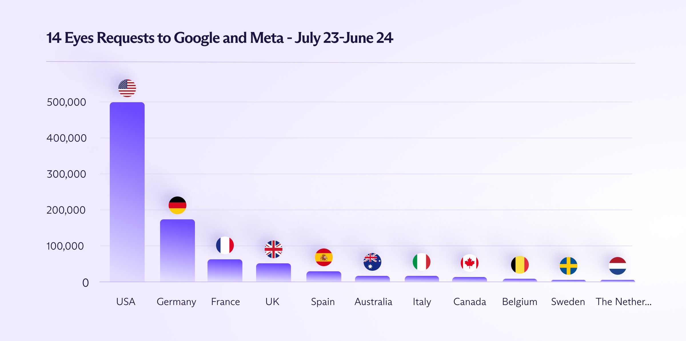 La raccolta di dati da parte del governo statunitense appare particolarmente estrema se confrontata con quella di altri Paesi, prosegue l’analisi di Proton. Negli ultimi 12 mesi, quando i dati erano disponibili, Google e Meta hanno ricevuto più richieste dal governo statunitense che dal resto della Fourteen Eyes Surveillance Community messa insieme.