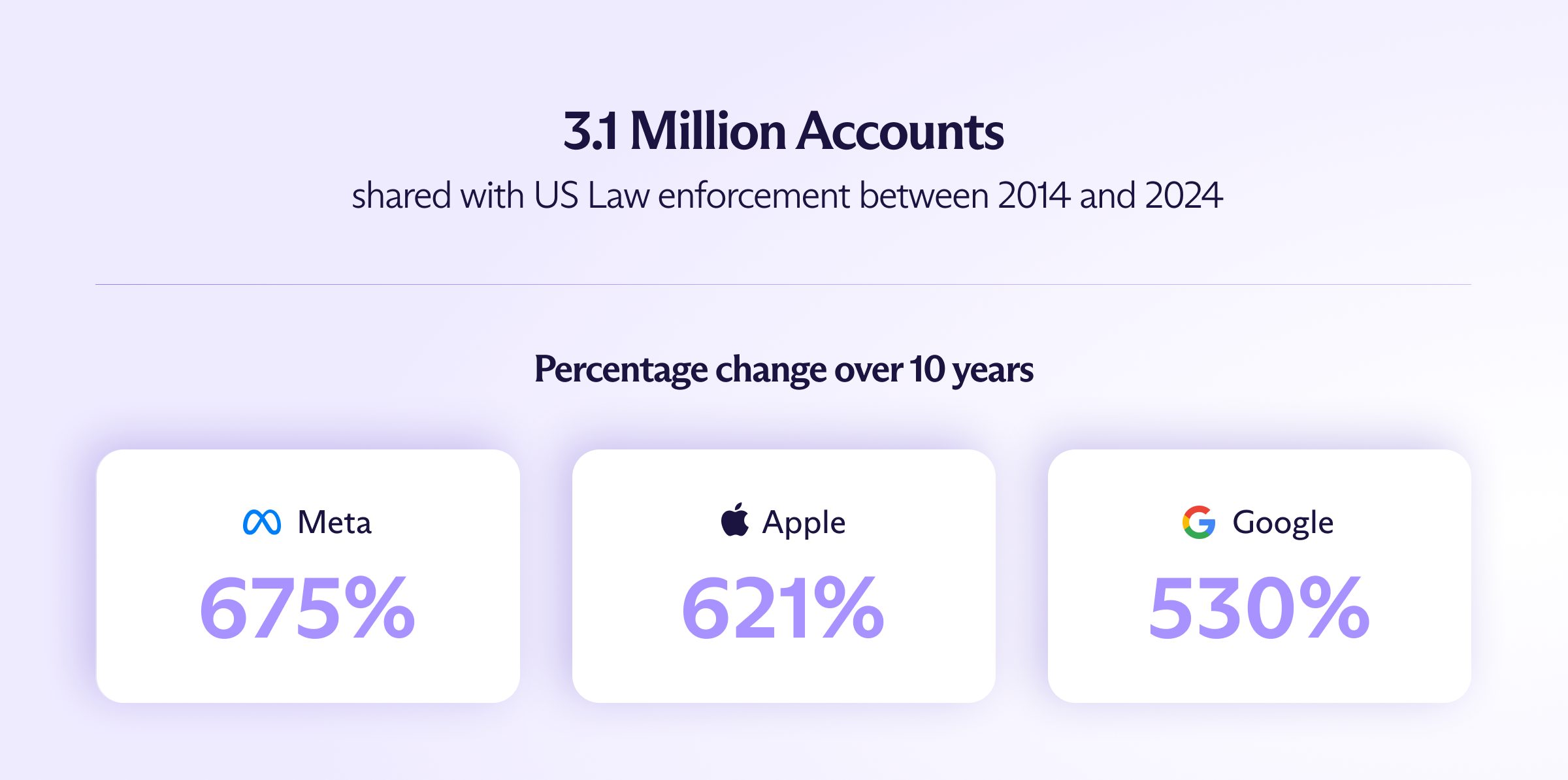 Proton, la società di privacy e sicurezza nota per le soluzioni Proton Mail, Proton VPN, Proton Drive e Proton Pass, ha pubblicato oggi una nuova ricerca che illustra il massiccio aumento dei dati degli utenti consegnati alle autorità statunitensi da Google, Apple e Meta negli ultimi dieci anni.
