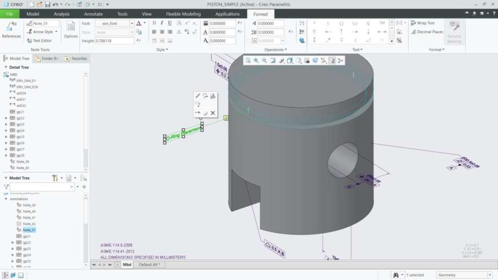 Per la definizione model based Creo 6.0 offre note autonome, un migliorato comportamento parent/child per le annotazioni, migliore propagazione delle annotazioni per le funzionalità di condivisione dei dati e ulteriori miglioramenti della produttività.