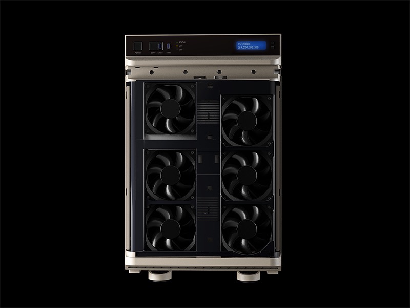 Il Nas TS-2888X supporta le schede GPU di accelerazione più diffuse di Nvidia, Amd e Intel.  Fornisce ben otto slot PCIe. Nonché una PSU 80Plus Platinum da 2.000 watt in grado di gestire fino a quattro schede grafiche high-end.