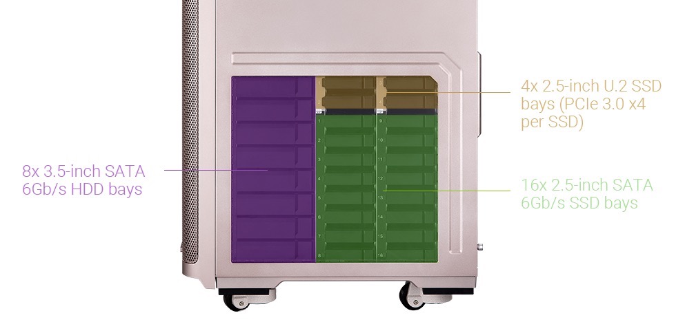 Qnap TS-2888X dispone di otto vani unità SATA 6Gb/s da 3,5″ per dischi rigidi. In più, di sedici vani unità SATA 6Gb/s da 2,5″ e quattro vani unità da 2,5″ che supportano SSD U.2 PCIe Gen3 x4 NVMe.