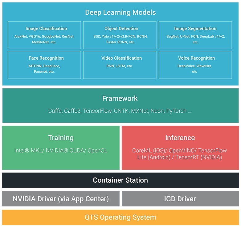 QuAI è un pacchetto software per creare, formare e ottimizzare rapidamente i modelli d’intelligenza artificiale in esecuzione nel Nas. Esso fornisce vari strumenti open-source e framework, inclusi Caffe, TensorFlow, AlexNet, FaceNet e molto altro.