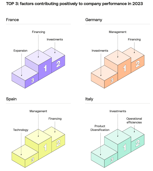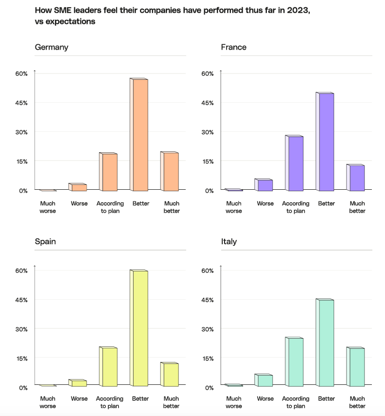 In Italia il 68% dei rispondenti ha dichiarato che i risultati del 2023 sono stati “migliori” o “decisamente migliori” del previsto, il dato si attesta intorno al 63% in Francia. Hanno performato significativamente sopra le aspettative le PMI di Germania (78%) e Spagna (75%).