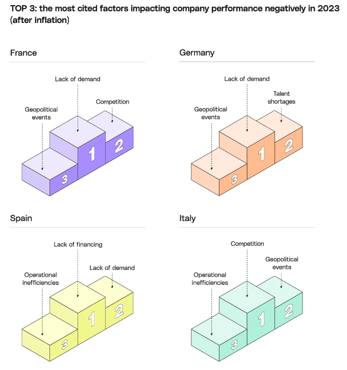 Oltre all’inflazione, il 57% delle aziende di Francia, Germania, Spagna e Italia ha identificato la mancanza di domanda come una delle principali sfide, mentre quasi un terzo ha menzionato eventi geopolitici come ulteriore fattore di preoccupazione.
