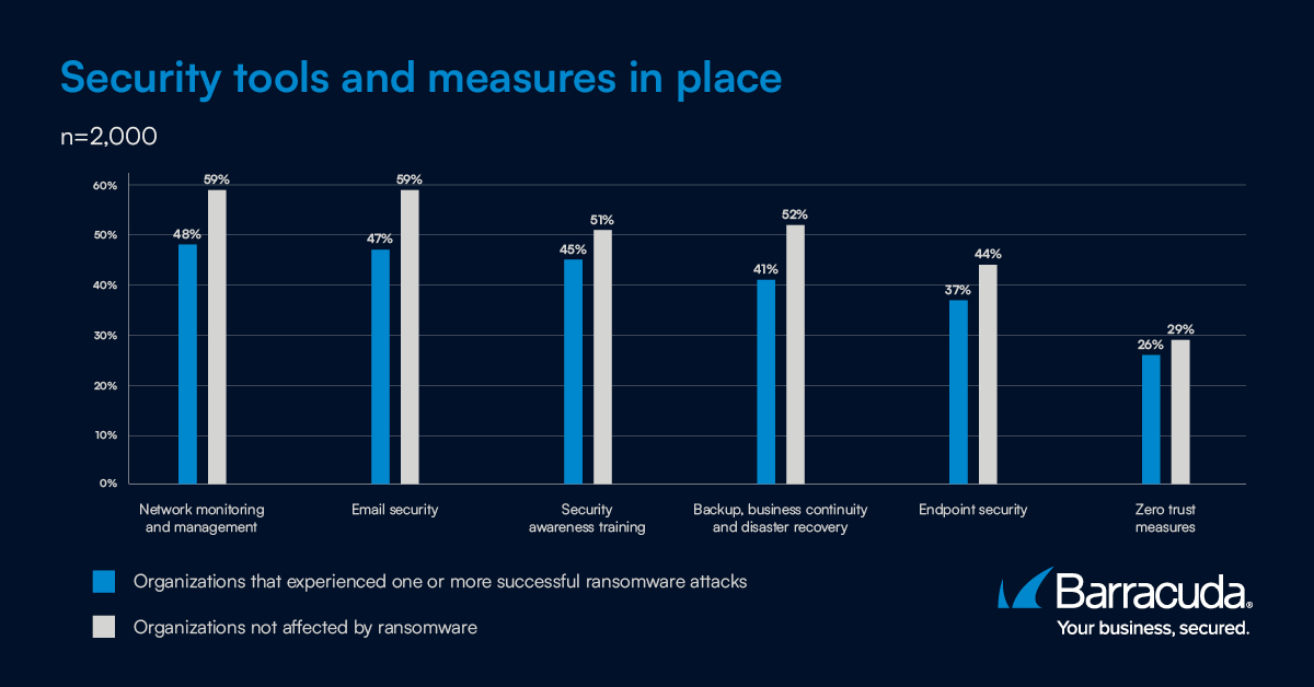 - Molte vittime di ransomware presentano una copertura di sicurezza insufficiente in aree chiave. Ad esempio, poco meno della metà (47%) delle vittime di ransomware ha implementato una soluzione di sicurezza delle e-mail, rispetto al 59% di coloro che non sono stati colpiti. Questo dato è rilevante perché la posta elettronica rappresenta uno dei principali vettori di attacco per il ransomware: il 71% delle organizzazioni che ha subito una violazione tramite e-mail è stato colpito anche da ransomware.