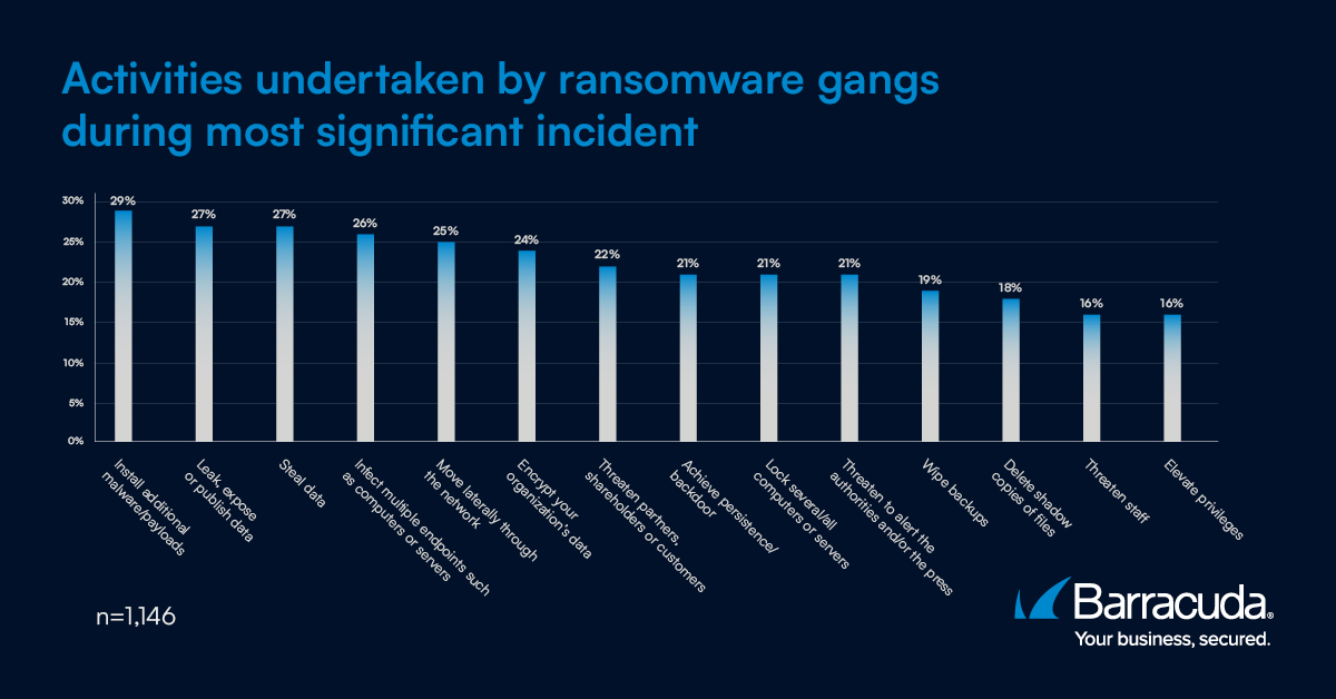 - Gli attacchi ransomware sono multidimensionali. Poco meno di un quarto (24%) degli incidenti ransomware segnalati dagli intervistati ha comportato la crittografia dei dati, mentre un numero significativo ha visto i cyber criminali rubare (27%) e pubblicare i dati (sempre 27%), infettare i dispositivi con altri payload malevoli (29%) o installare backdoor per mantenere l’accesso (21%).
