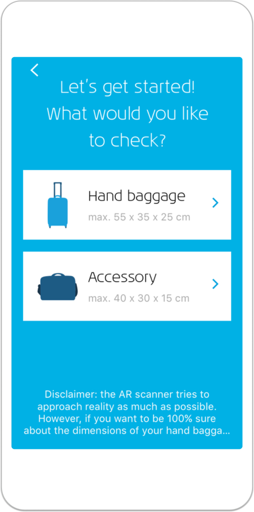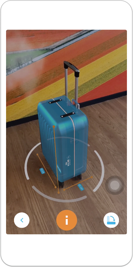 app KLM per iOS realtà aumentataMediante la realtà aumentata, l’app consente di posizionare l’immagine virtuale nell’ambiente reale e di utilizzarla in modo interattivo. Ciò rende più facile per un passeggero controllare, quando è ancora a casa, se il bagaglio a mano scelto ha le dimensioni corrette.