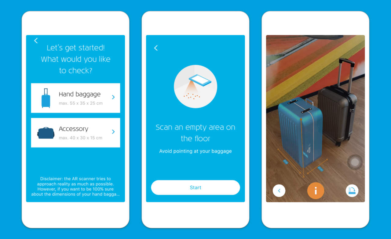 Il nuovo servizio è dedicato ai passeggeri: li aiuta a controllare il proprio bagaglio a mano in maniera molto semplice. Con la realtà aumentata, la app di KLM usa una valigia trasparente virtuale. Questa valigia virtuale indica le dimensioni consentite per il bagaglio a mano da portare con sé a bordo.