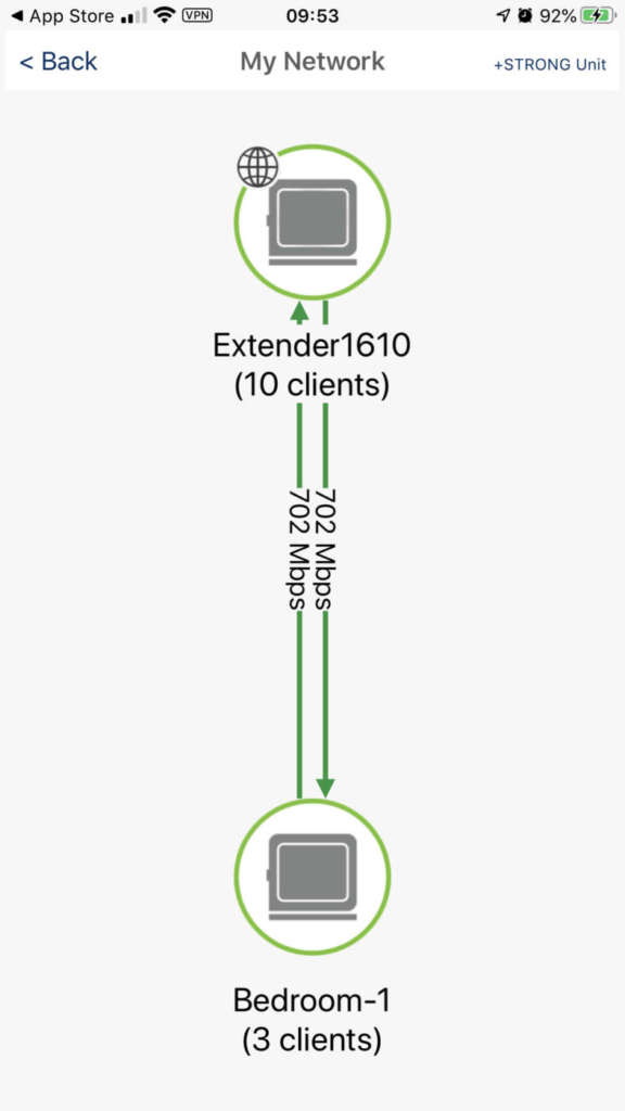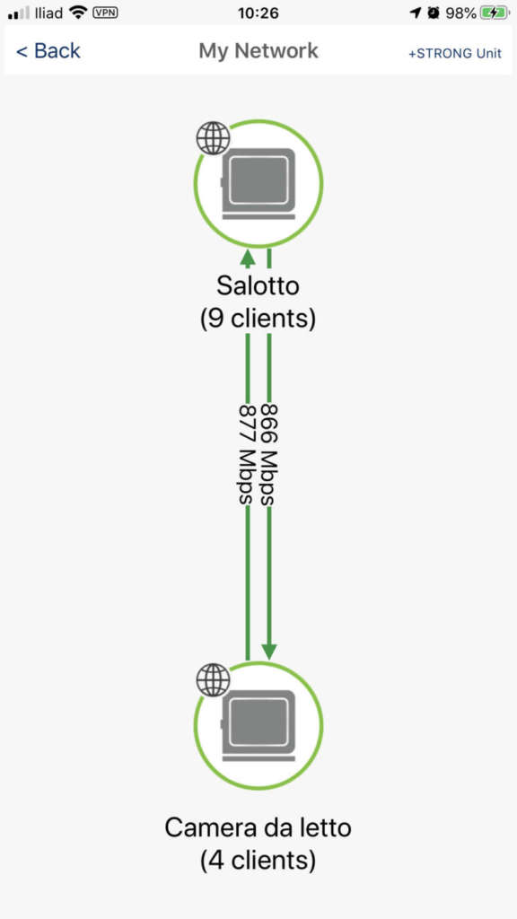 L’applicazione mobile Strong Mesh, disponibile gratuitamente su iTunes App Store e Google Play Store, è decisamente più amichevole nei confronti dell’utente generico, pur offrendo meno opzioni sulle quali agire rispetto al pannello web. Molto utile in fase di impostazione iniziale la schermata My Network che mostra in uno schema grafico gli access point e i collegamenti che sono instaurati fra loro, evidenziando le velocità di uplink e downlink. Tale mappa dinamica è importante per trovare eventuali colli di bottiglia e ripensare, se necessario, alla disposizione nell’ambiente dei singoli ripetitori, con l’obiettivo di raggiungere le migliori performance possibili.