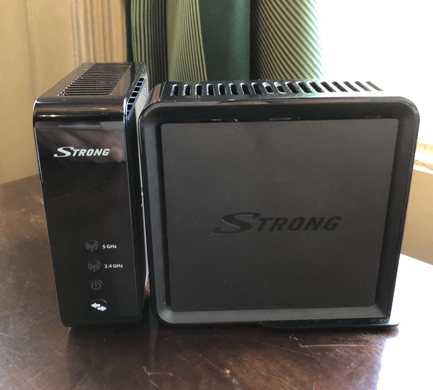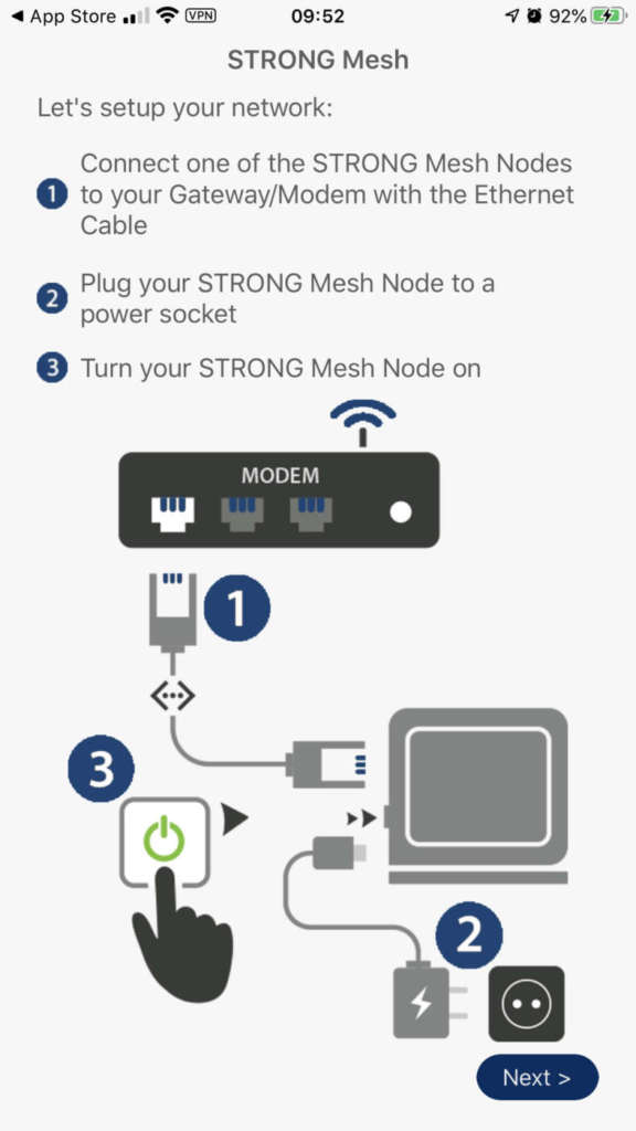 I nodi fra loro comunicano tramite tecnologia Wi-Fi Mesh con un canale dedicato, capace così di evitare interferenze alla navigazione senza fili; la velocità di navigazione in casa dipende fortemente da quanto è stabile il collegamento fra i singoli nodi, caratteristica che dipende dal posizionamento relativo e dalla loro installazione: i led anteriori indicano con un rassicurante colore verde che il ponte radio è di buona qualità, mentre per misure più dettagliate occorre accedere all’applicazione gratuita Strong Mesh per dispositivi dotati di sistema operativo iOS e Android. Il sistema crea una maglia fra tutti i singoli componenti, soprattutto quando sono in numero maggiore di due, implementando tutte le connessioni possibili e instradando ogni trasmissione verso quello più adatto secondo la qualità del segnale radio, l’occupazione dello stesso e la destinazione finale.