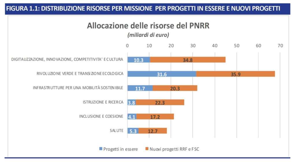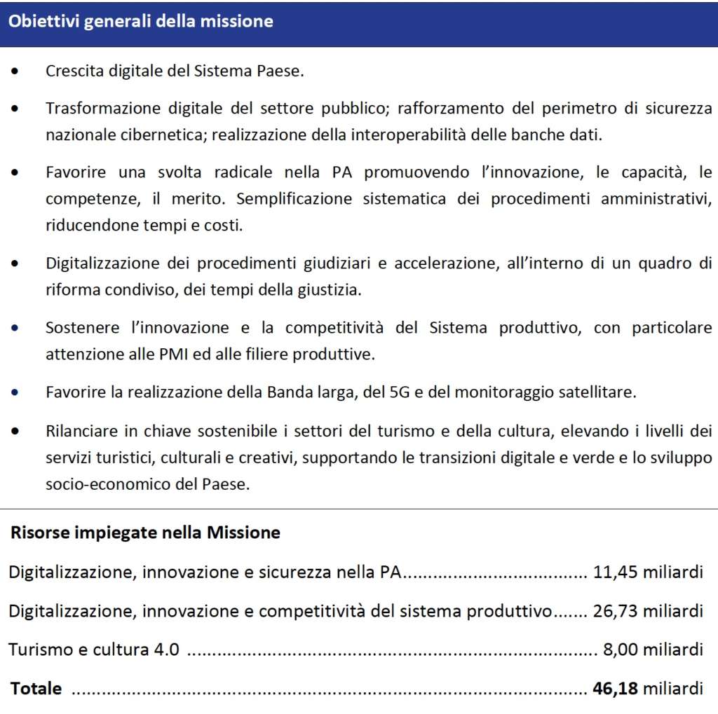 Oltre alla digitalizzazione, infatti, il piano ha altre cinque missioni. L’inclusione e la coesione, la rivoluzione verde e transizione ecologica; istruzione e ricerca, infrastrutture per la mobilità sostenibile, sanità.