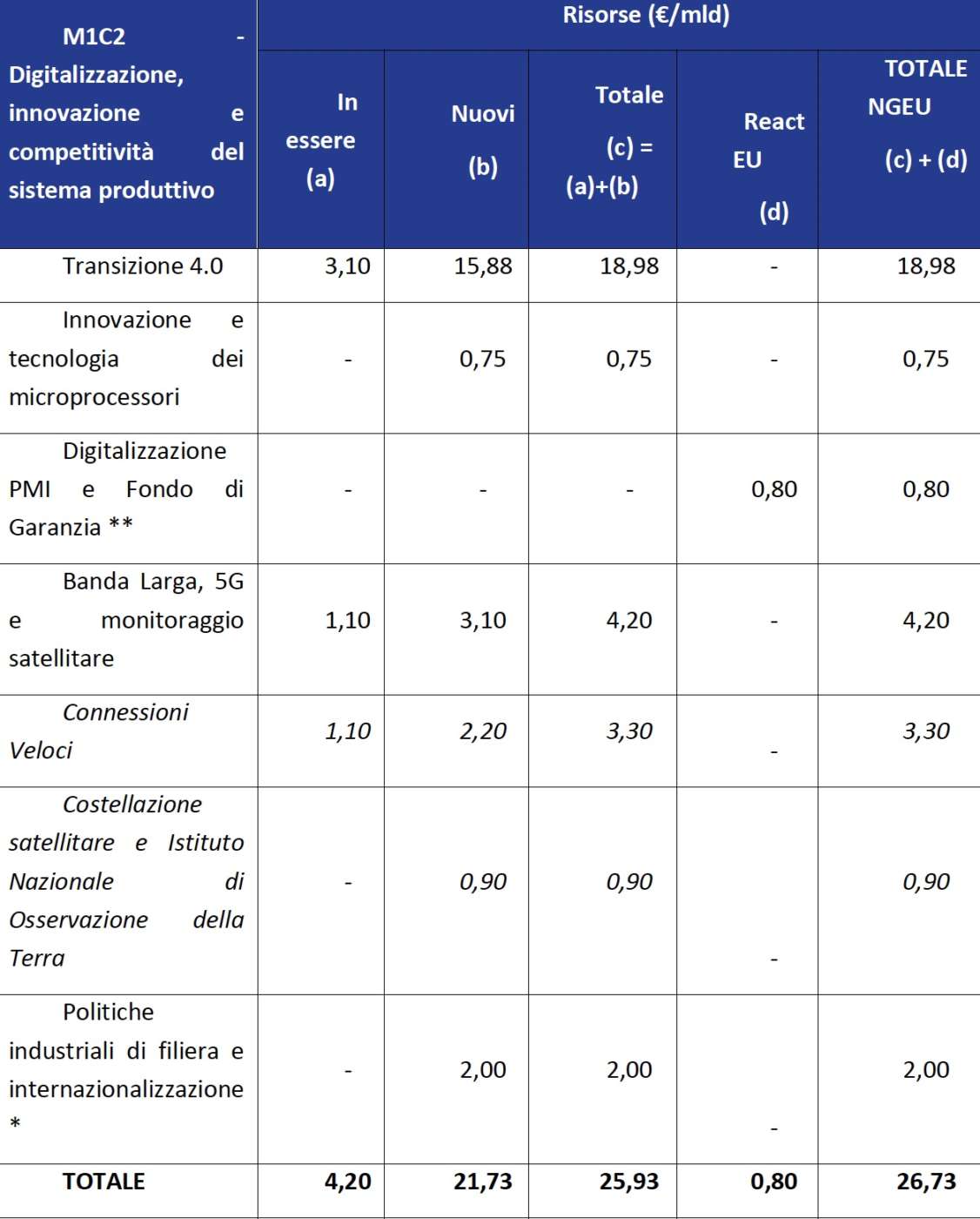 Le risorse sono suddivise in 26,73 miliardi per la Digitalizzazione, innovazione e competitività del sistema produttivo, 11,45 miliardi per la Digitalizzazione, innovazione e sicurezza nella Pubblia amministrazione e 8 miliardi per Turismo e Cultura 4.0.