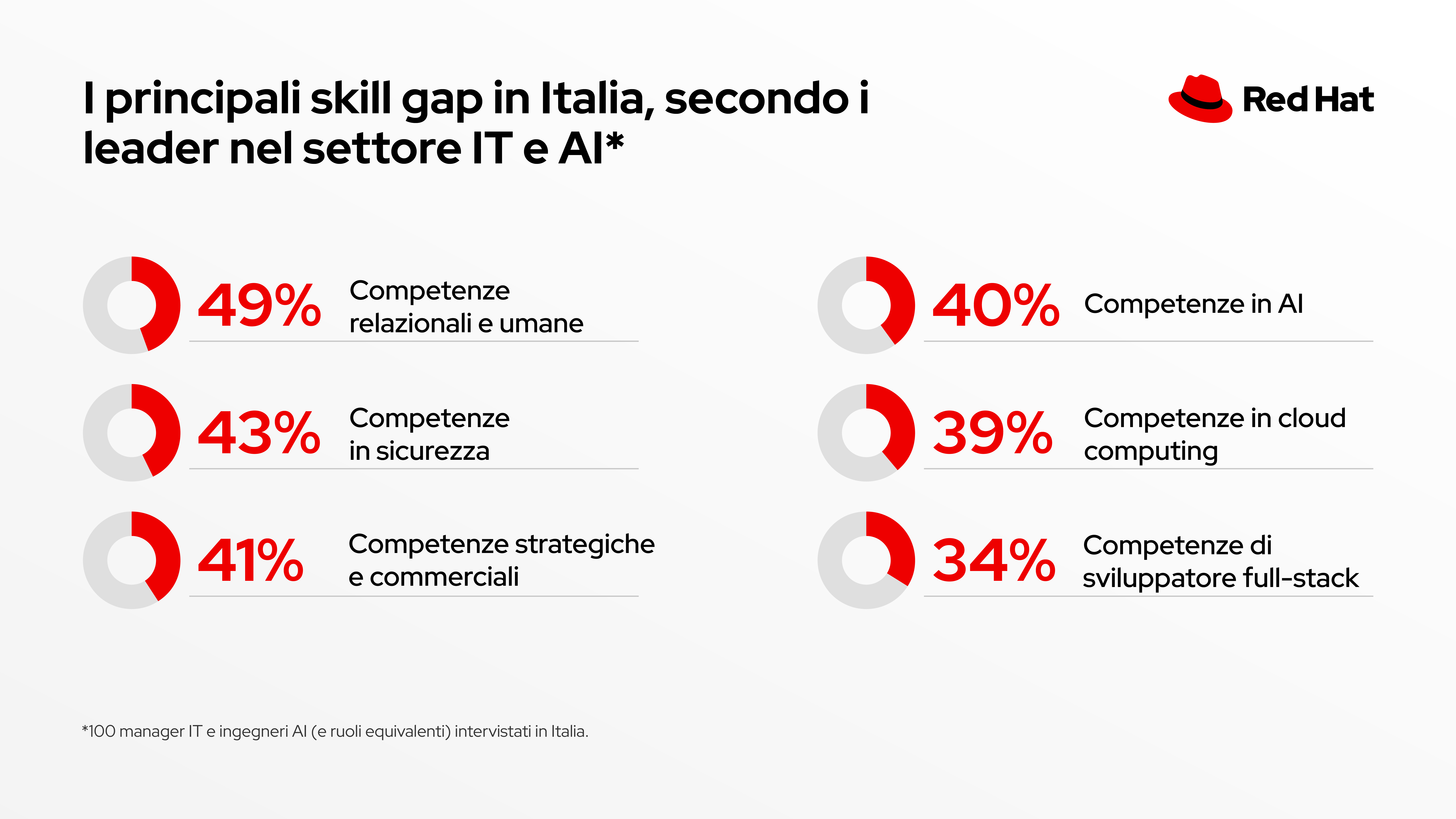 Mantenere e sviluppare i talenti giusti rimane una sfida, mette in evidenza Red Hat, con le competenze personali e umane indicate come l’aspetto più urgente da affrontare per il 49% degli intervistati italiani, seguite da competenze di sicurezza (43%), strategiche e di business (41%). Le competenze in materia di intelligenza artificiale seguono da vicino, con il 40%. In questo specifico ambito, la priorità principale per i leader IT e AI italiani è rappresentata dall’educazione del business all’uso dell’AI e dal collegamento dell’AI ai dati aziendali, entrambe con il 55%, seguite dall’utilizzo efficiente delle funzionalità dell’AI (40%).