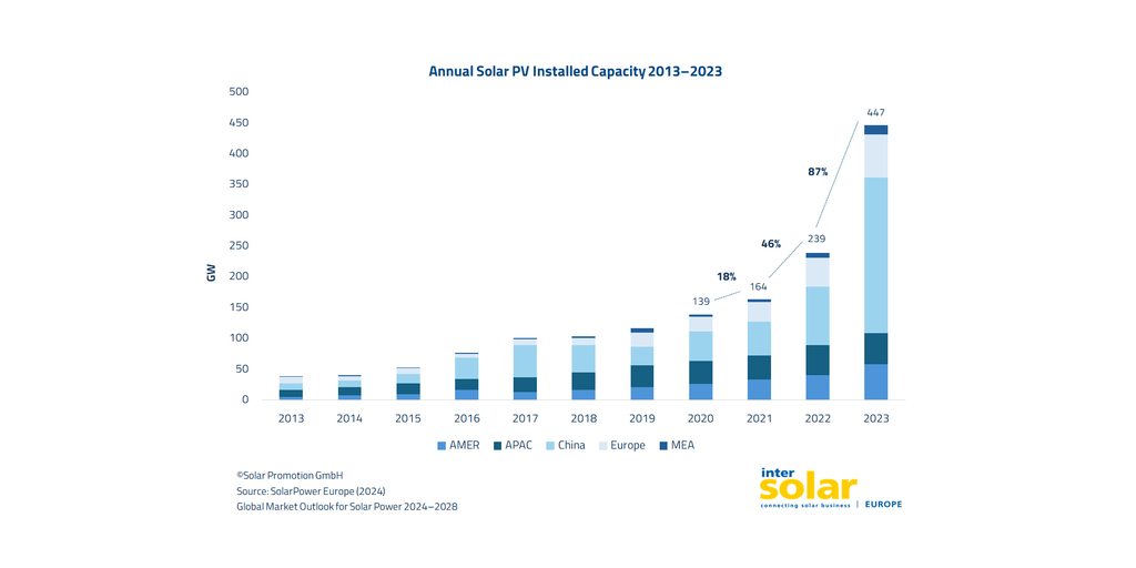Il rapporto di SolarPower Europe “Prospettive del mercato globale dell’energia solare 2024-2028” riporta una crescita del fotovoltaico globale dell’87% nel 2023 rispetto all’anno precedente.