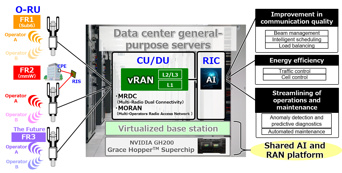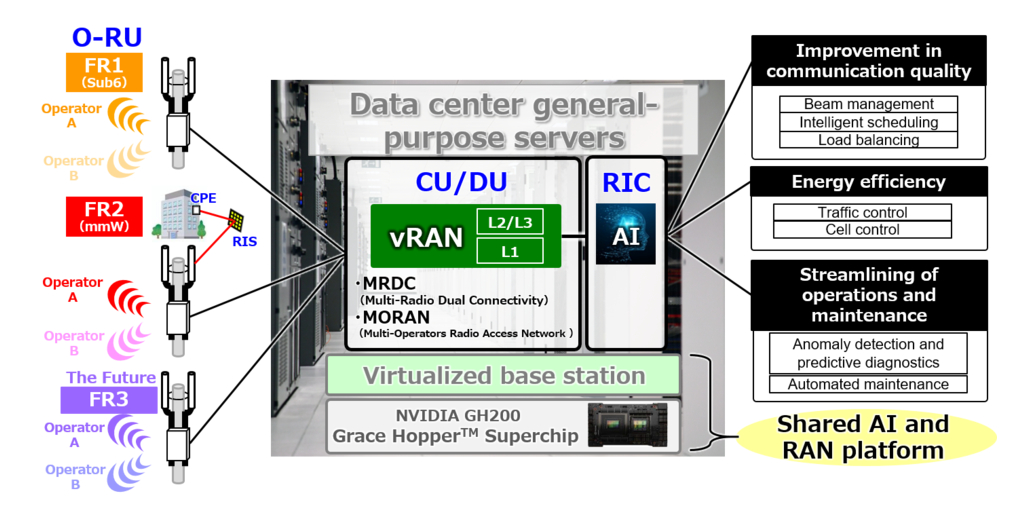 Con l'accelerazione della trasformazione digitale (DX) a livello globale, le reti mobili 5G sono diventate un'infrastruttura fondamentale per la società. Kyocera sta sfruttando le sue tecnologie di telecomunicazione e di virtualizzazione proprietarie e sviluppate a livello globale per offrire le funzionalità della stazione base a server generici utilizzando il superchip NVIDIA GH200 Grace HopperTM. Tramite l'IA, le stazioni base 5G virtualizzate di Kyocera miglioreranno le prestazioni, ridurranno il consumo energetico e semplificheranno le operazioni e la manutenzione.