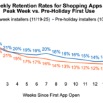 L’analisi condotta da Airship mostra coinvolgimento e attivazioni inferiori da parte dei clienti che hanno acquisito un’app durante il periodo di picco dello shopping delle feste, quando le nuove installazioni aumentano del 40%-100% rispetto alle medie di ottobre