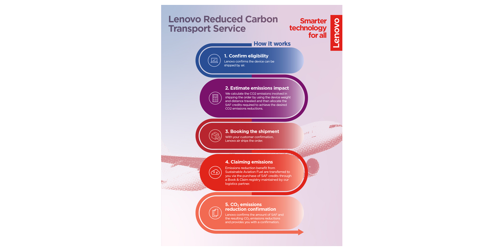 RALEIGH, North Carolina–(BUSINESS WIRE)–Per sostenere i clienti aziendali attenti alle emissioni di carbonio nel loro viaggio sulla strada della sostenibilità, Lenovo offre ora un esclusivo servizio di trasporto a ridotte emissioni di anidride carbonica che consente alle aziende di contenere il loro impatto sulle emissioni di carbonio quando dispositivi informatici vengono spediti per via aerea. Attraverso questo servizio i clienti possono acquistare crediti SAF (Sustainable Aviation Fuel, benzina avio sostenibile) e attribuire il vantaggio in termini della riduzione di emissioni al loro acquisto di dispositivi informatici, conseguendo una riduzione di almeno il 70% delle emissioni di CO21.
