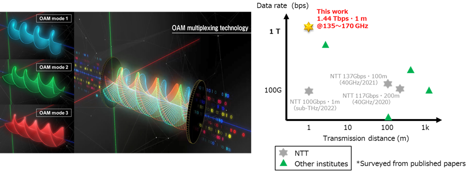 TOKYO–(BUSINESS WIRE)–Nell’obiettivo di implementare la trasmissione wireless con capacità di terabit a supporto della domanda di connessioni wireless negli anni 2030, NTT Corporation (NTT) ha realizzato con successo la prima trasmissione wireless muliplexing a capacità elevata con “momento angolare orbitale” (OAM, Orbital Angular Momentum) al mondo, a 1,44 Tbit/s, utilizzando una banda ultralarga da 32 GHz. Si tratta di un’innovativa tecnologia di comunicazione wireless che utilizza la banda sub-terahertz (sub-THz); questo risultato consentirà l’accesso wireless a grandi volumi di informazioni a una velocità di trasferimento dati superiore a 1 Tbit/s. Questo successo è stato ottenuto utilizzando la banda sub-THz in una gamma compresa tra 135 GHz e 170 GHz, e rappresenta una tecnologia di comunicazione wireless innovativa che permette l’accesso wireless a un’enorme quantità di informazioni a oltre 1 Tbit/s.