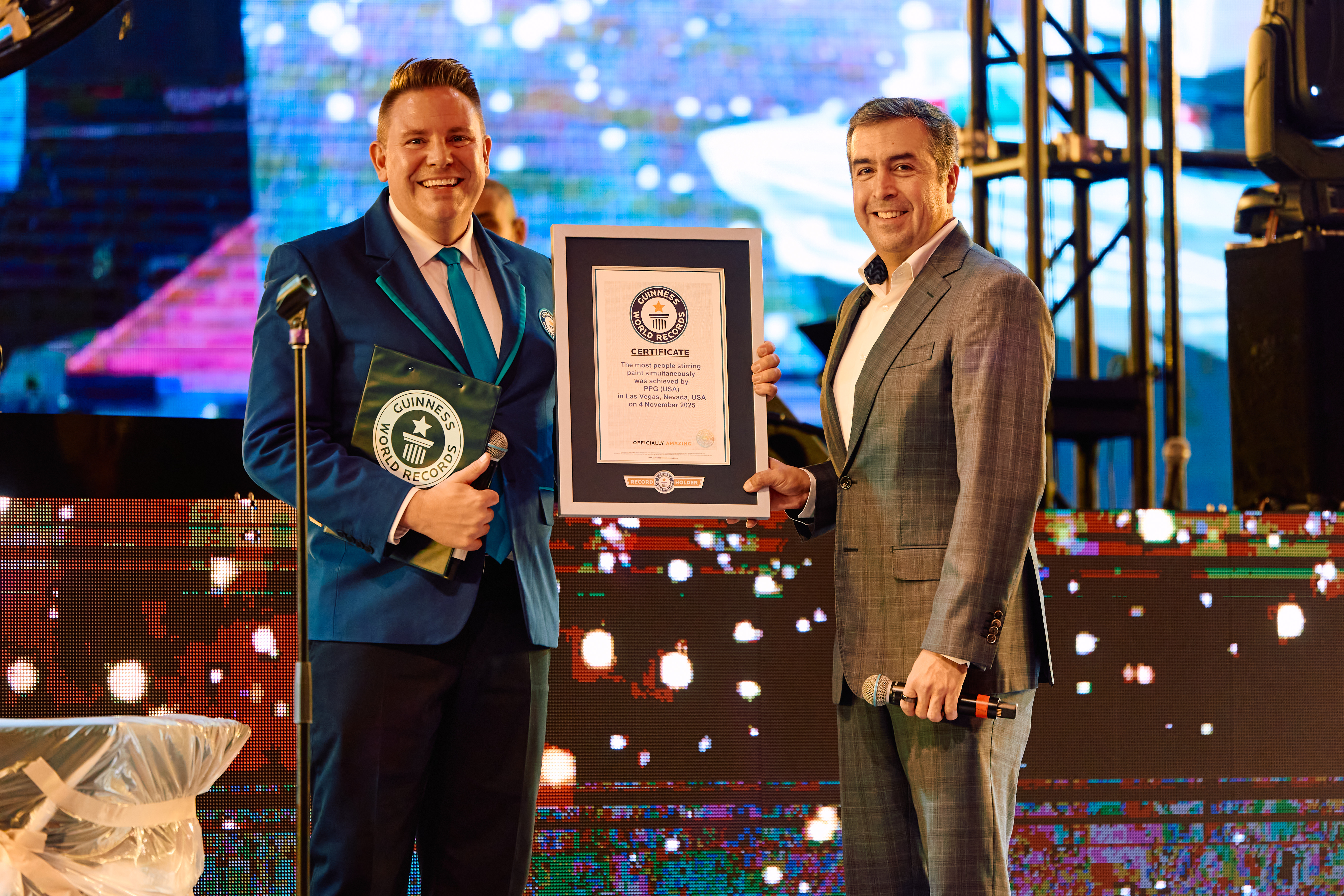 LAS VEGAS--(BUSINESS WIRE)--PPG (NYSE: PPG) ha annunciato oggi di aver ottenuto un titolo nel GUINNESS WORLD RECORDS™ per la più grande sfida simultanea di miscelazione di vernici al SEMA Show 2025 di Las Vegas. Oltre 275 partecipanti hanno mescolato vernice per dimostrare quanto sia ancora comune il lavoro manuale nella riparazione delle auto, prima che PPG presentasse la sua nuova soluzione automatizzata SEM MIX’N’SHAKE™.