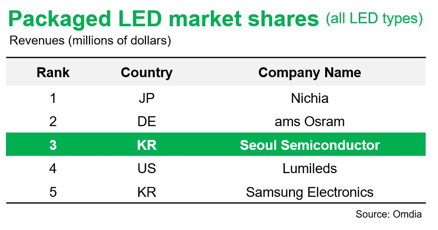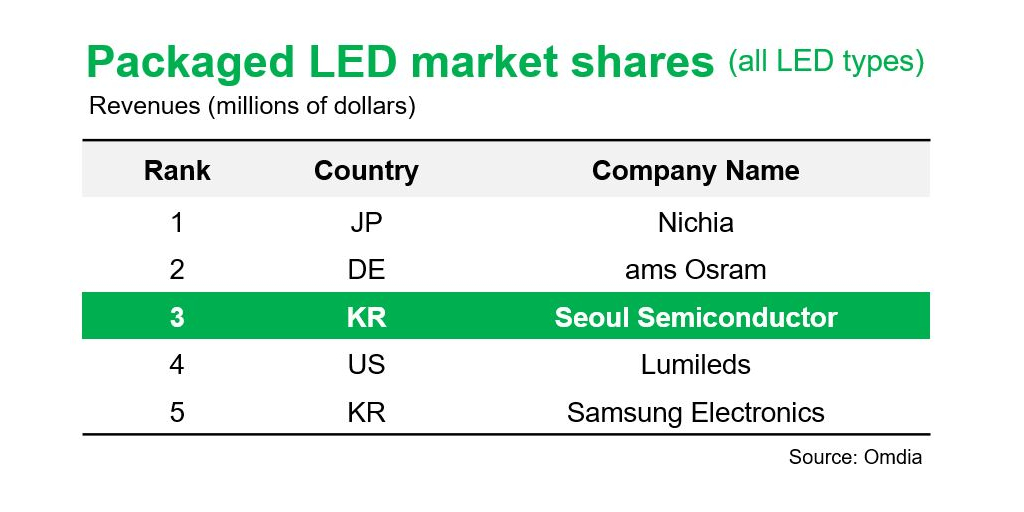 SEUL, Corea del Sud–(BUSINESS WIRE)–Secondo la “2022 Global LED Lighting Market Analysis” di TrendForce e il database pubblicato da Omdia, Seoul Semiconductor Co., Ltd. (KOSDAQ:046890), azienda di semiconduttori ottici a livello globale, si conferma al terzo posto sul mercato globale e in cima alla classifica in Corea, un riflesso degli straordinari traguardi raggiunti dall’azienda con oltre 18.000 nuovi brevetti tecnologici.