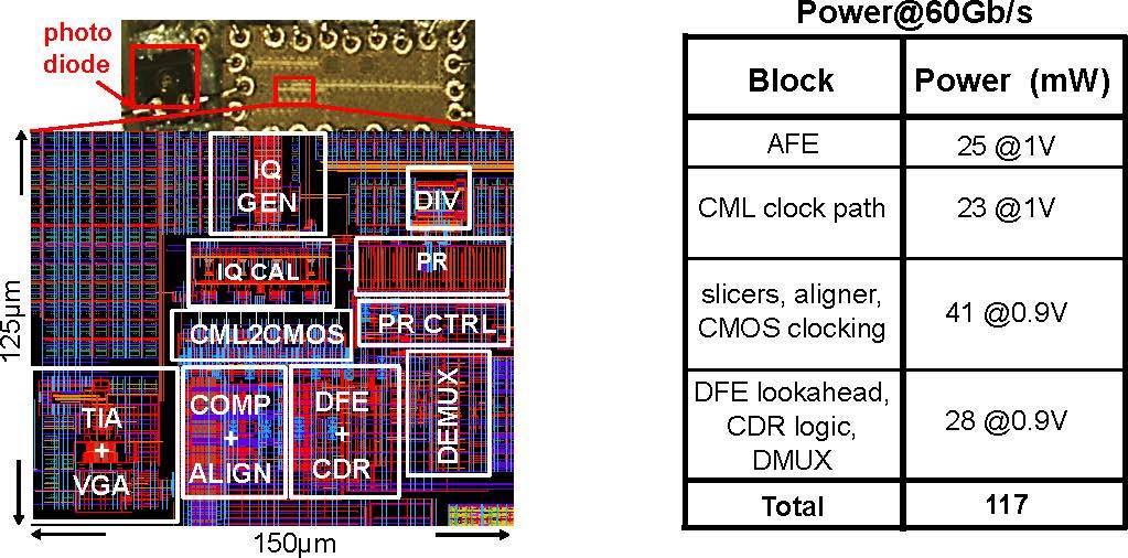 Alcuni ricercatori del centro di ricerca Ibm di Zurigo, in occasione dell’edizione 2017 del Symposium on VLSI Technology and Circuits di Kyoto, hanno illustrato un ricevitore ottico a 60gb/s in un singolo canale, costruito con tecnologia CMOS, a un costo che si stima essere inferiore rispetto alle normali interconnessioni in rame.