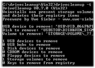 Sostituendo l’opzione -t con uno degli switch riportati digitando drivecleanup -? al prompt, invece, si richiederà la rimozione delle informazioni legate alla tipologia di supporti di memorizzazione indicata.