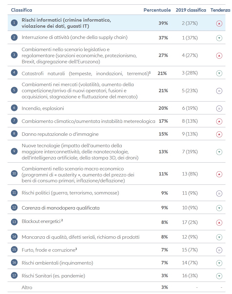 La nona edizione dell’Allianz Risk Barometer 2020 dice che i rischi informatici (con il 39% delle risposte) rappresentano il rischio aziendale maggiormente percepito a livello globale, facendo passare al secondo posto l’interruzione di attività (Business interruption) con il 37% delle risposte.