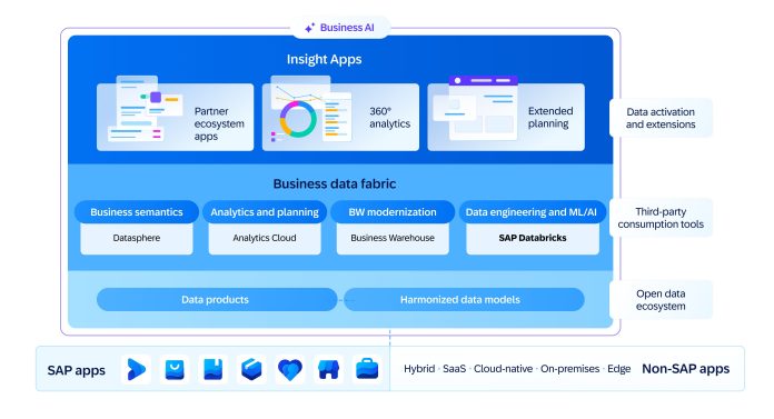 SAP Business Data Cloud offrirà anche nuove funzionalità chiamate insight apps, che utilizzano data products e modelli AI collegati ai dati in tempo reale per fornire analisi avanzate e pianificazione in tutte le aree aziendali, compresi i core analytics aziendali, la finanza e le risorse umane.