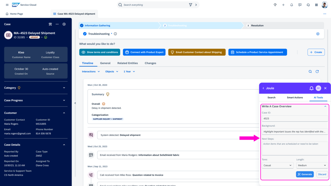• Automatizzazione delle attività ad alta intensità di lavoro con strumenti di AI basati sui ruoli: le nuove funzionalità di AI includono più di 10 strumenti basati sui ruoli in ambito CX per aumentare la produttività e l’efficienza automatizzando le attività di routine e liberando il tempo delle persone per gestire aspetti più sfumati del business. Ad esempio, quando si verifica un problema, l’AI può aiutare il team responsabile del Servizio clienti a riepilogare la situazione e allineare i responsabili sull’accaduto, fornire elementi che aiutino a capire l’opinione del cliente, suggerire una soluzione e persino tracciare la rapidità con cui il problema è stato risolto. Questa automazione aumenta l’efficienza, incrementando gli utili netti dell’azienda e dando alle persone più tempo per concentrarsi su iniziative strategiche.