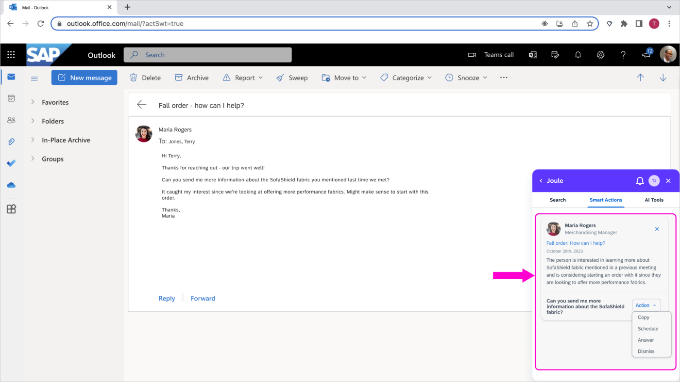 • Attivazione di risposte rapide e accurate con AI proattiva e contestuale: l’utilizzo dell’AI per identificare e rispondere alle domande dei clienti consentirà ai team di vendita e assistenza di concentrarsi sulle attività a maggior valore aggiunto. Ad esempio, un responsabile vendite potrebbe ricevere un’e-mail da un cliente che chiede informazioni sui prodotti: un documento che include in modo intelligente una serie di Domande e Risposte può leggere l’e-mail, indicare le domande importanti e suggerire al responsabile vendite una risposta scritta che comprende le informazioni più aggiornate sul prodotto.
