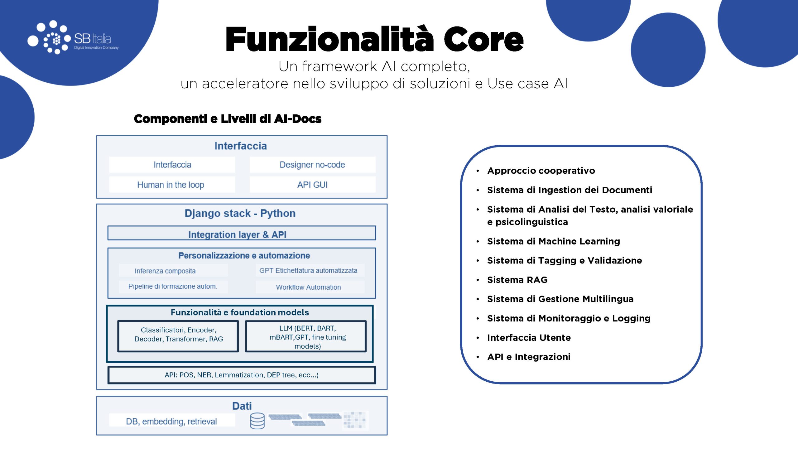 Rodolfi ha subito voluto sgombrare il campo da fraintendimenti: AI-Docs non è un tool isolato, ma un framework strutturato e modulare, progettato per integrare e orchestrare tecnologie eterogenee di intelligenza artificiale.