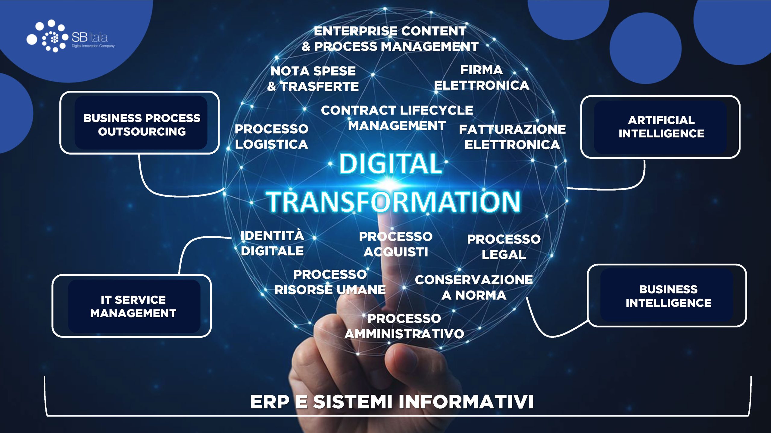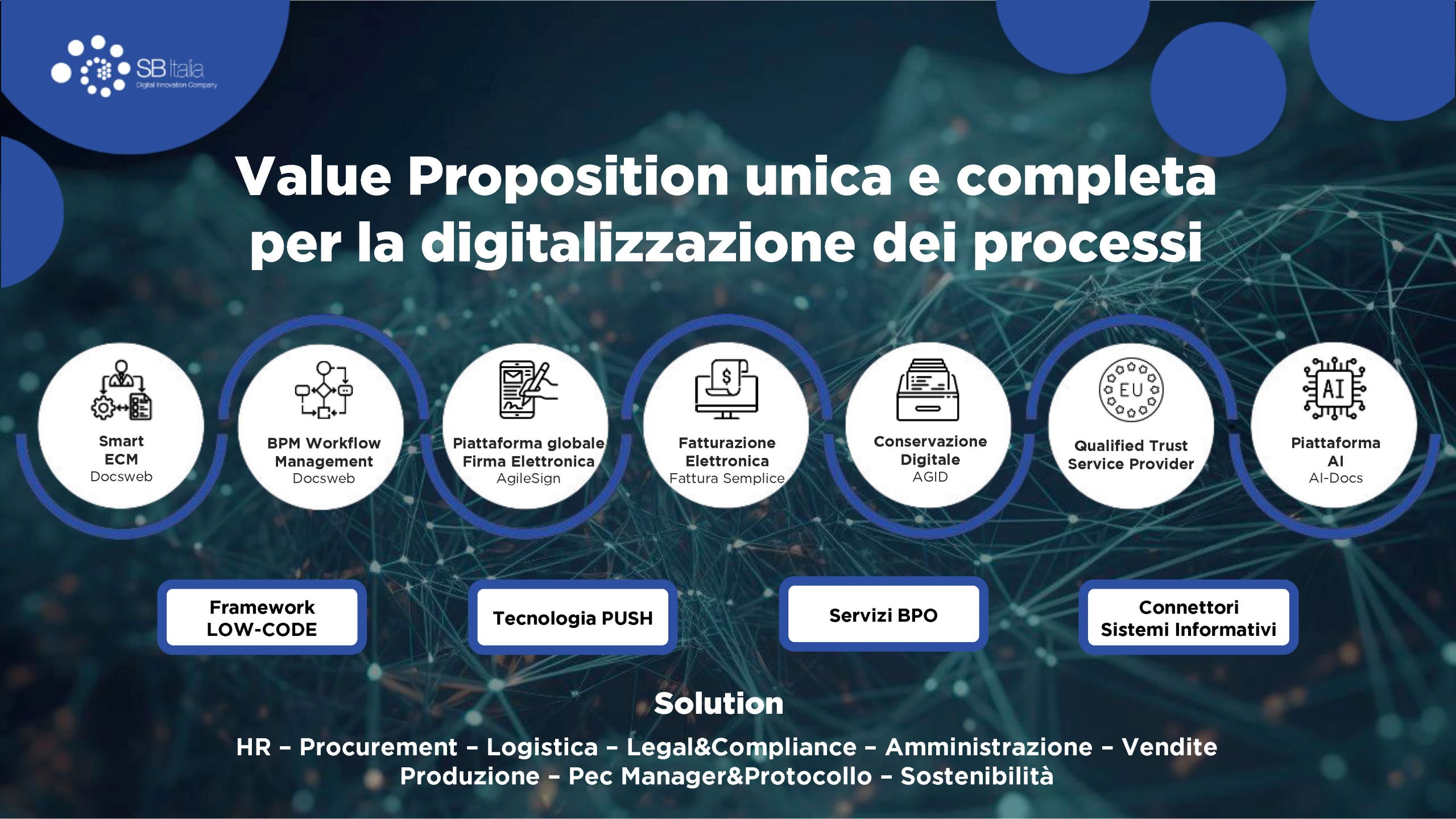 Dalla system integration all’innovazione process-driven, SB Italia si presenta oggi come Digital Innovation Company, come un gruppo in grado di costruire soluzioni avanzate e di gestire progetti innovativi, integrando tecnologie proprietarie, servizi e consulenza per il settore privato e la Pubblica Amministrazione.