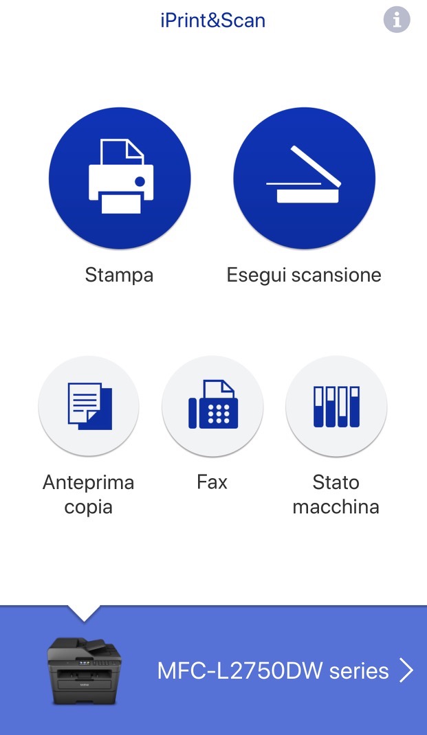 L’app Brother iPrint&Scan presenta un’interfaccia pulita ed essenziale, in cui è facile orientarsi. Naturalmente le funzionalità disponibili dipendono anche dalle caratteristiche e dalla compatibilità offerte dalla periferica selezionata, visualizzata nella schermata.
