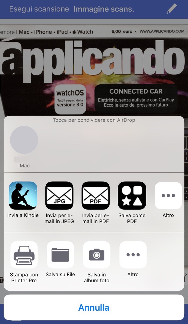 Puoi anche inviare direttamente per email il documento in JPEG o PDF. Così come utilizzare le altre opportunità di condivisione offerte da iOS, dalle app installate e dai servizi configurati.