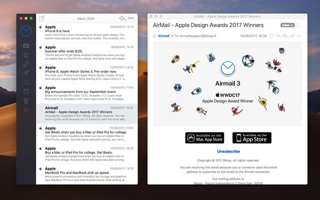 Airmail supporta Gmail, iCloud, Outlook.com, Exchange, Yahoo! Mail e più in generale tutti gli account POP3 e IMAP. Non solo: si integra con i servizi di cloud storage come Google Drive, Dropbox, CloudApp, Box, Onedrive, Droplr, FTP . Sicuramente utile l’integrazione con le applicazioni GTD (Get Things Done), tra cui Omnifocus, Calendar, Evernote, Todolist e molte altre, oltre ovviamente a supportare i calendari/promemoria di macOS e iOS. Nel momento in cui scriviamo. Il prezzo di Airmail (acquistabile da Mac App Store) è di 30 euro.