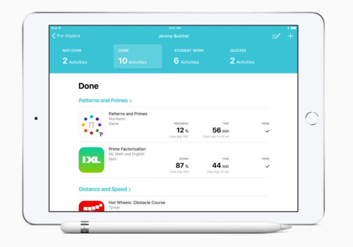 Schoolwork funziona all’unisono con l’app Classroom come ”assistente didattico” che consente di avere il controllo sulla tecnologia usata in classe. Innanzitutto, Classroom permette ai docenti di mantenere gli studenti concentrati su un’app o un sito web. Consente inoltre di vedere gli schermi degli alunni durante le lezioni, condividere documenti con loro, assegnare iPad condivisi e altro.