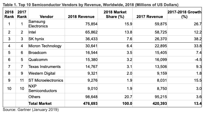 Il primo fornitore di semiconduttori è Samsung Electronics, che ha aumentato il proprio vantaggio grazie al boom del mercato delle DRAM. Il fatturato combinate dei 25 principali vendor di semiconduttori è aumentato del 16,3% nel 2018. Questi hanno rappresentato il 79,3% del mercato e hanno fatto registrare una performance superiore agli altri.
