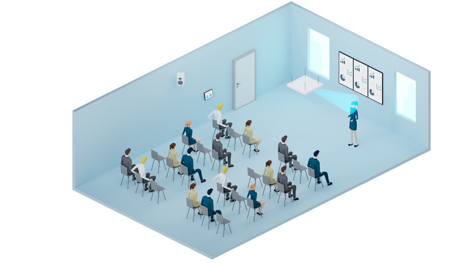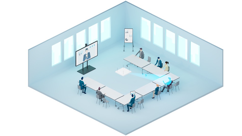 La soluzione è progettata per offrire un audio di alta qualità in tutta la sala riunioni con un unico microfono e per far sì che la voce di chi sta parlando risulti udibile in modo chiaro indipendentemente da dove si trovi nella stanza, anche se si muove all’interno di essa.
