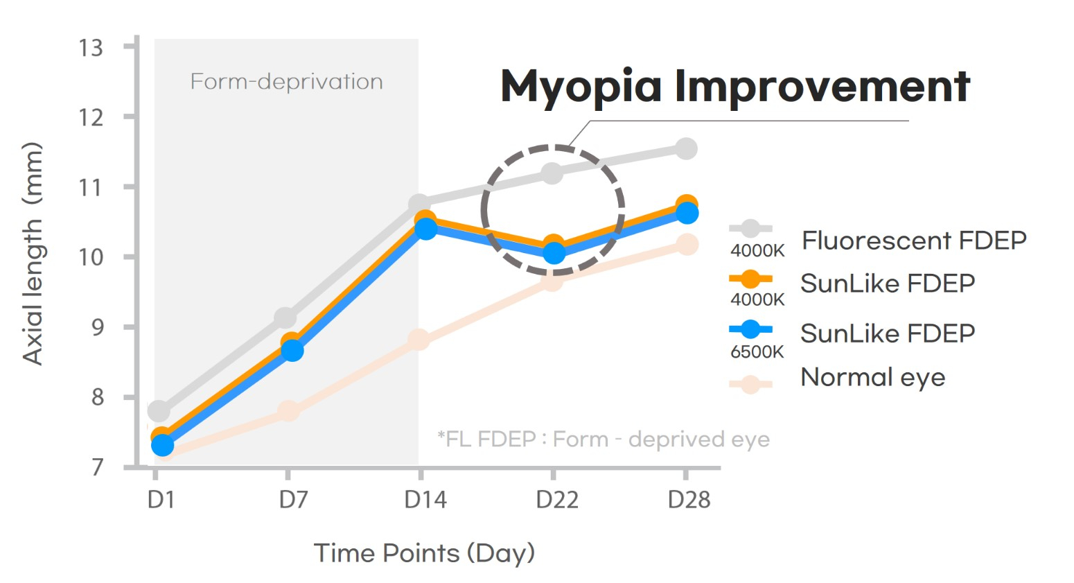 In questo esperimento, gli occhi dei pulcini, simili a quelli dell’uomo, sono stati esposti a diverse fonti di illuminazione, monitorando successivamente la lunghezza dei loro bulbi oculari, causa principale della miopia. Per prima cosa, uno degli occhi dei pulcini è stato coperto per 14 giorni con un’apposita copertura per indurre la miopia. Successivamente la copertura è stata rimossa e il gruppo 1 è stato esposto a una lampada fluorescente convenzionale da 4.000 K, mentre i gruppi 2 e 3 sono stati esposti rispettivamente a sistemi di illuminazione SunLike da 4.000 K e 6.500 K.