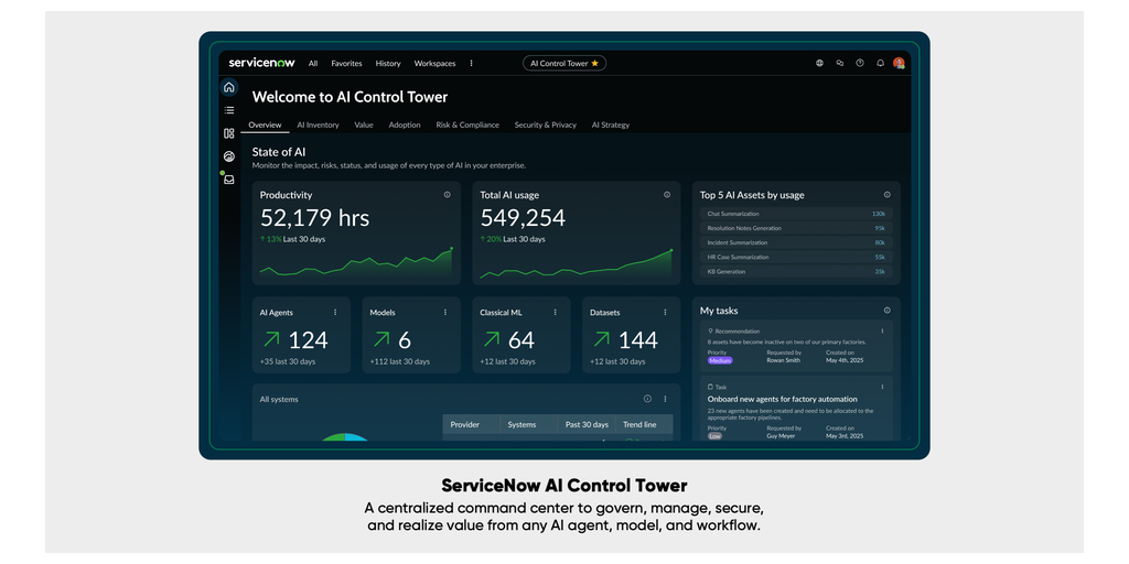 LAS VEGAS--(BUSINESS WIRE)--Knowledge 2025 – Today, at ServiceNow’s annual customer and partner event, Knowledge 2025, ServiceNow (NYSE: NOW), the AI platform for business transformation, launched the new AI Control Tower, a centralized command center to govern, manage, secure, and realize value from any ServiceNow and third-party AI agent, model, and workflow on a single unified platform. AI Control Tower optimizes AI investments and ensures seamless, responsible integration into customers’ enterprise strategies. In addition to AI Control Tower, ServiceNow also introduced AI Agent Fabric, a solution that delivers new levels of agent-to-agent and multi-model communication and collaboration. ServiceNow partners, including Accenture, Adobe, Box, Cisco, Google Cloud, IBM, Jit, Microsoft, Moonhub, RADCOM, UKG, and Zoom, are among those to be offering the first AI Agent Fabric integrations for seamless, wall to wall enterprise workflows across third-party agents.