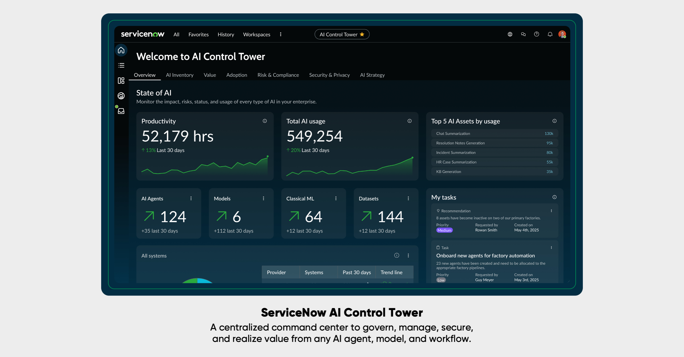 Embedded across all workflows in the ServiceNow AI Platform, and building on the recently announced AI Agent Orchestrator, the AI Control Tower centralizes strategy, governance, performance, and management across the entire AI ecosystem while driving enterprise-grade compliance and accountability. With the AI Control Tower customers achieve: