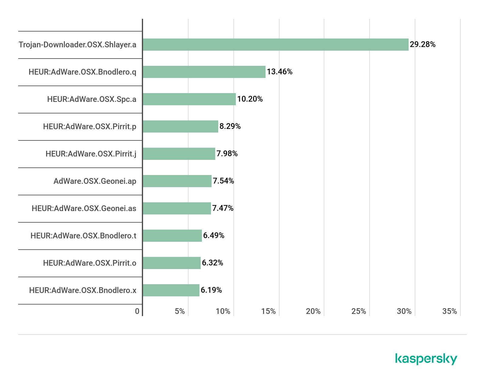 Quasi tutte le altre 10 principali minacce per il mondo macOS, sottolineano ancora i ricercatori Kaspersky, sono adware che Shlayer installa: AdWare.OSX.Bnodlero, AdWare.OSX.Geonei, AdWare.OSX.Pirrit e AdWare.OSX.Cimpli.