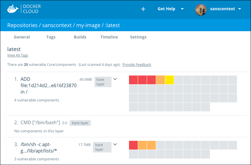 Il Docker Hub ha una funzione (a pagamento) per la scansione delle immagini dei container: va alla ricerca delle principali vulnerabilità conosciute e presenta un “indice” di pericolosità dell’immagine nel suo complesso. La funzione di scansione elenca i problemi rilevati e queste indicazioni servono agli sviluppatori per capire come eliminarli. E a noi per non scaricare l’immagine prima che sia stata corretta.
